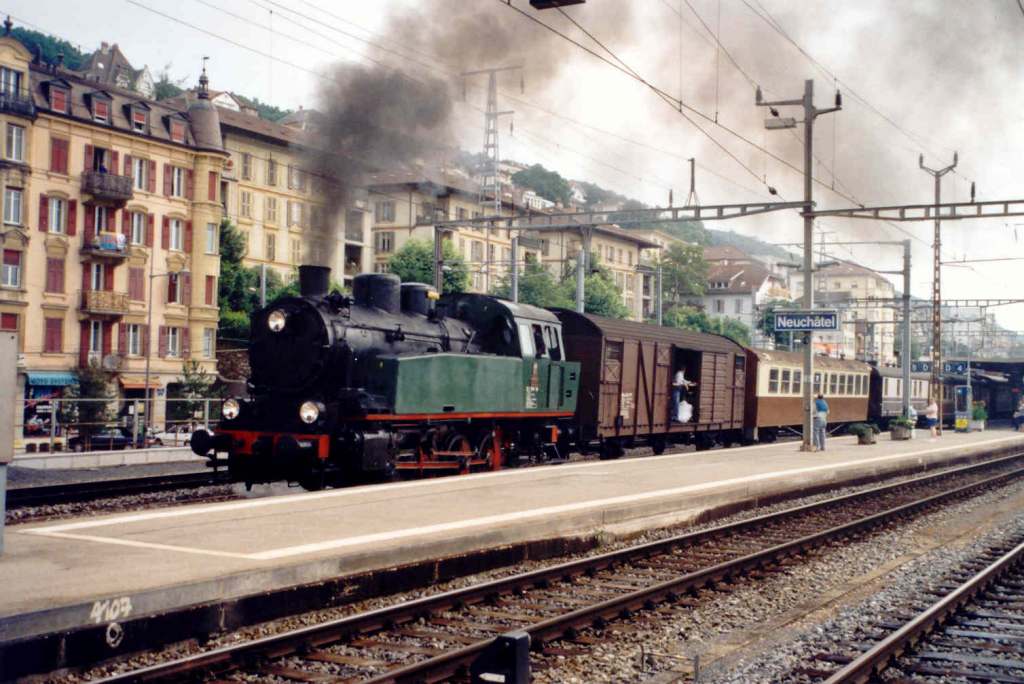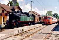 Gare de Travers : départ simultané de la Krauss-Maffei assurant le train St-Sulpice - Pontarlier et de la Slask circulant de Neuchâtel à St-Sulpice |