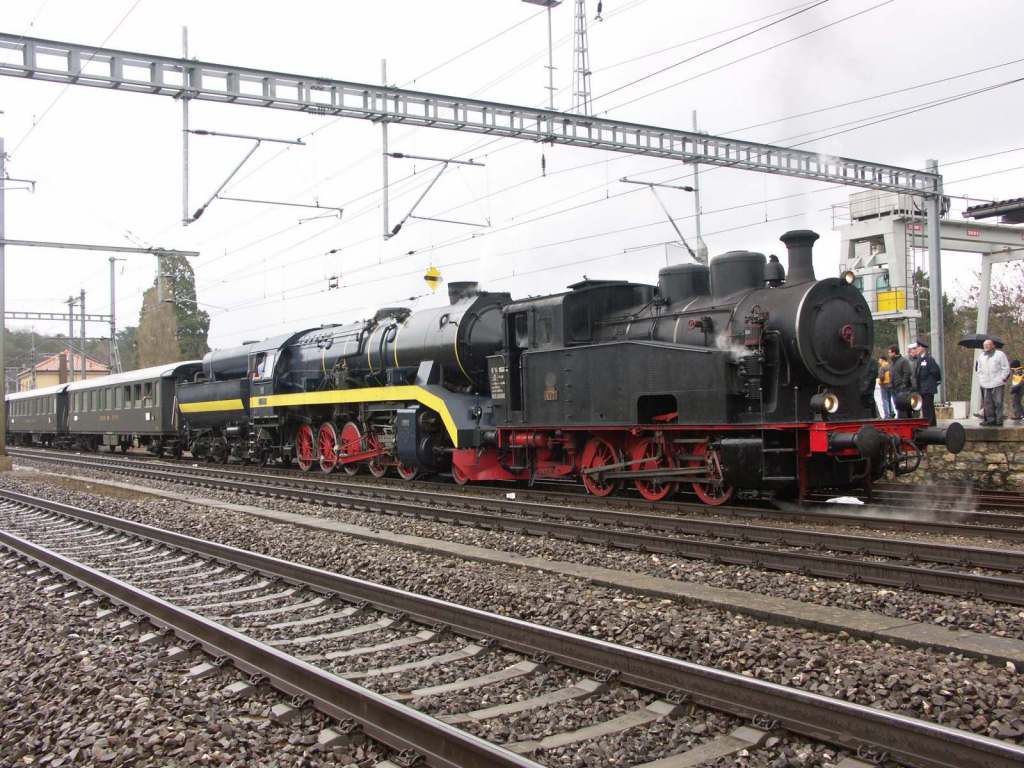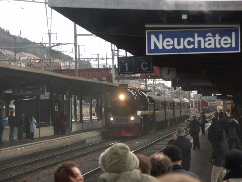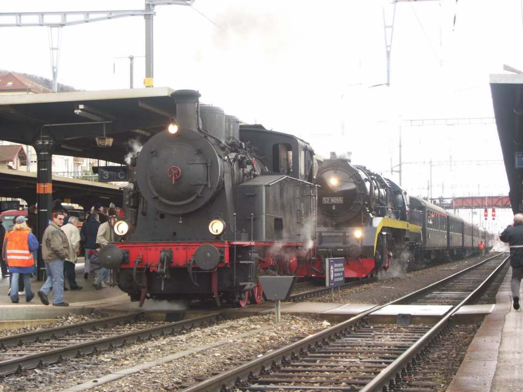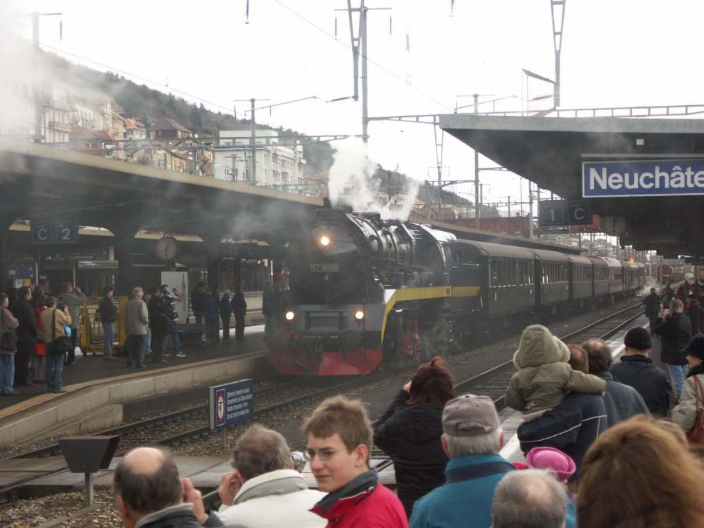 Pour acheminer de Bâle à Yverdon la machine à vapeur Maffei 576 de 1926 qui devrait permettre au Neuchâtel - dernier bateau "demi-salon" préservé de Suisse - de reprendre bientôt une vie active, l'association Trivapor désirait un événement exceptionnel : C'est donc un train à vapeur comble de huit voitures tiré par la 52 8055 de DLM qui s'est chargé de cette prestation. D'une manière symbolique, Trivapor souhaitait que sa machinerie soit tirée par une locomotive du même constructeur ... c'est ce qui explique que la plus neuchâteloise des Krauss-Maffei ait rejoint le convoi dès Neuchâtel, jusqu'aux Ateliers Principaux CFF d'Yverdon dont nous aimerions remercier ici les employés venus bénévolement nous assister pour les manœuvres. L'histoire du bateau et les projets de l'association sont à découvrir sur le site http://www.trivapor.ch ... de même que quelques autres photos de cette journée exceptionnelle. Si la neige était présente au rendez-vous à St-Sulpice, nécessitant même l'emploi du chalumeau pour dégeler les aiguilles, elle avait cependant déjà délaissé le littoral ... |