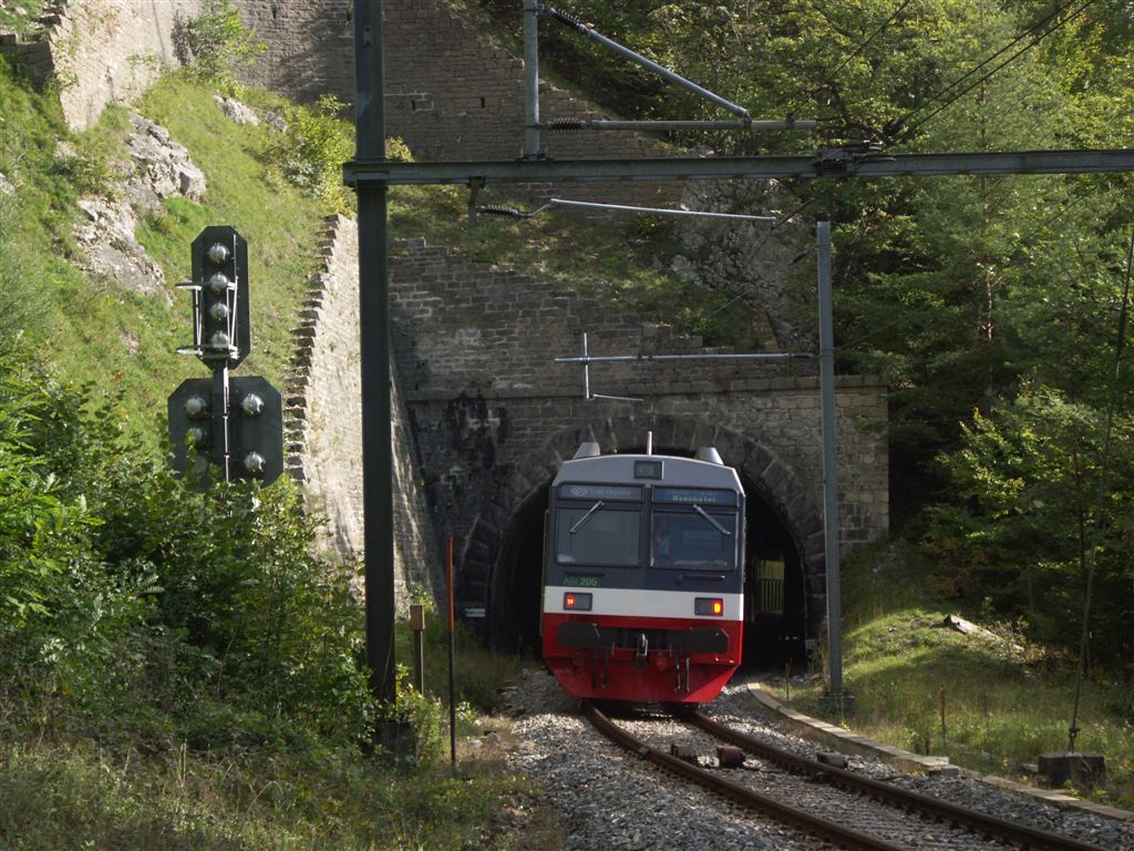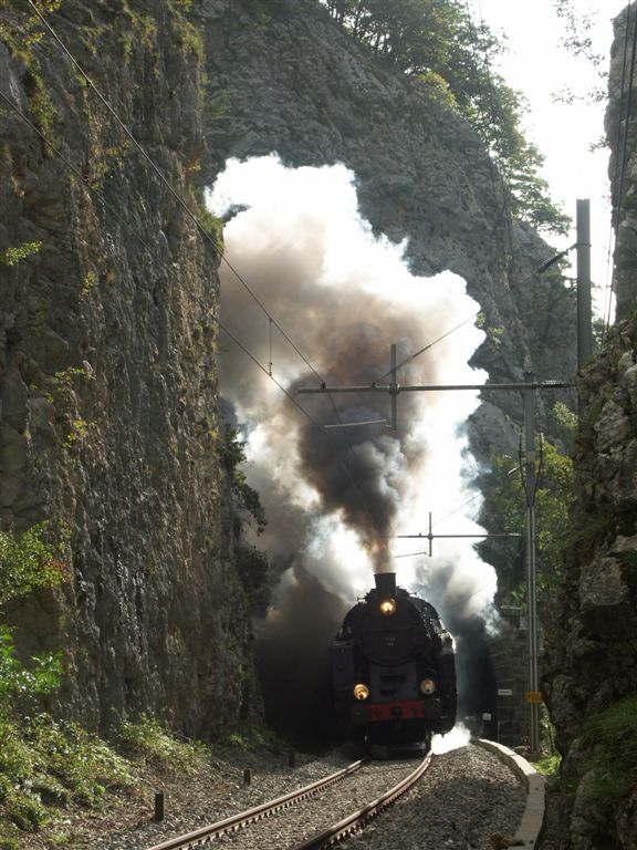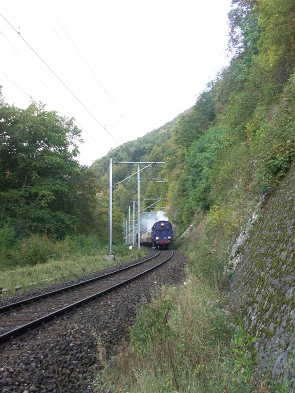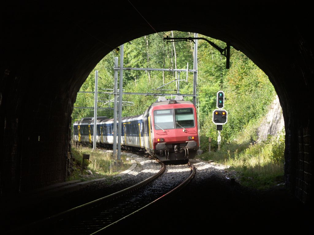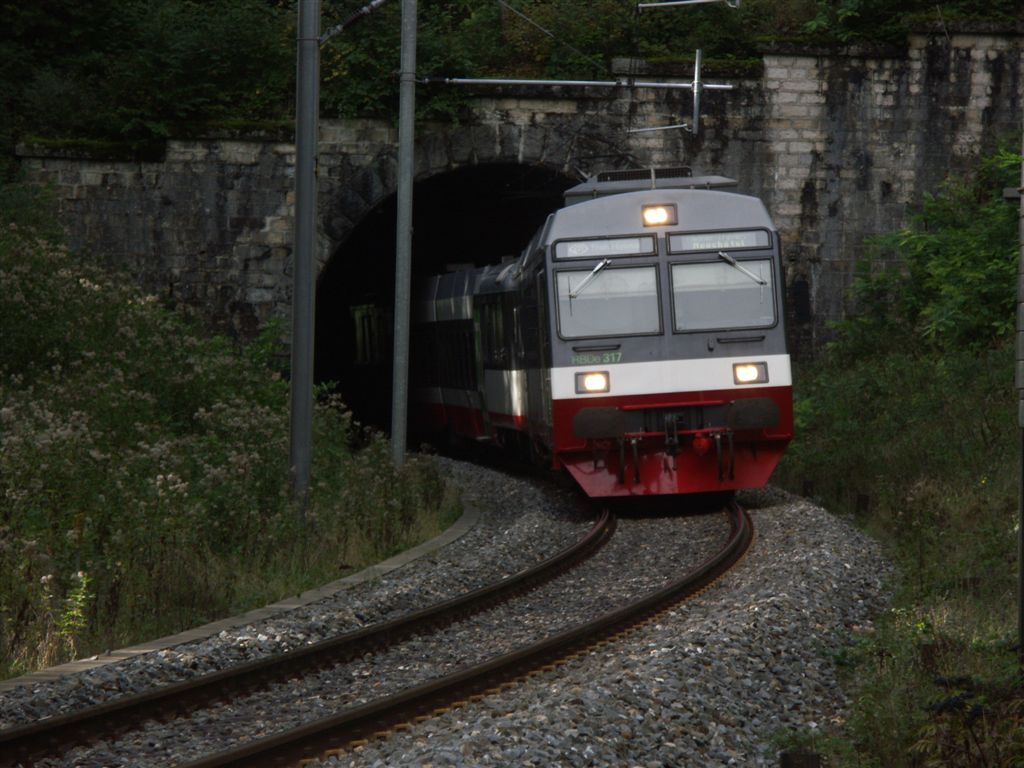| Le revoici, surgissant d'un tunnel en rampe de 20 pour mille lors de la remontée des Gorges de l'Areuse... | ||