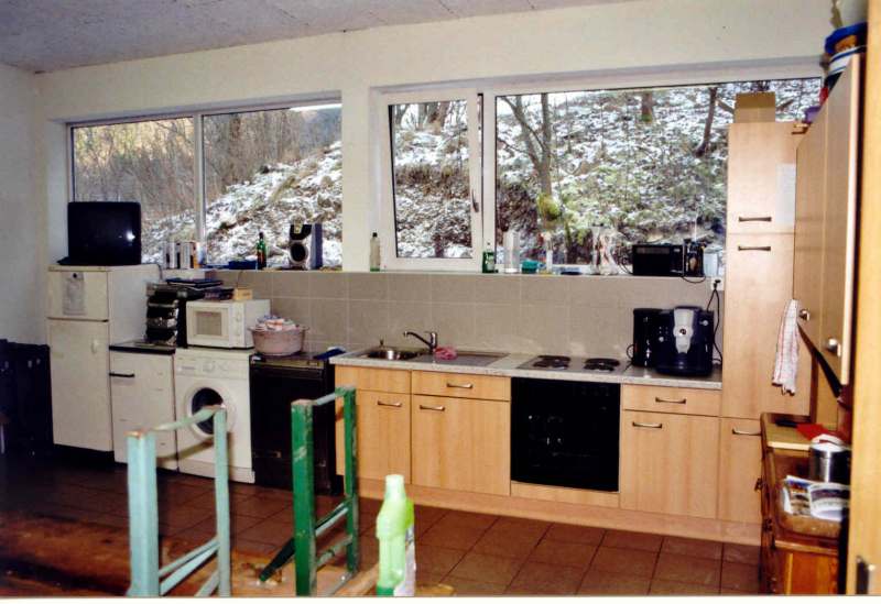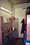 Essraum mit Waschmaschine für Arbeitkleider The messing area with a washing machine for overalls.