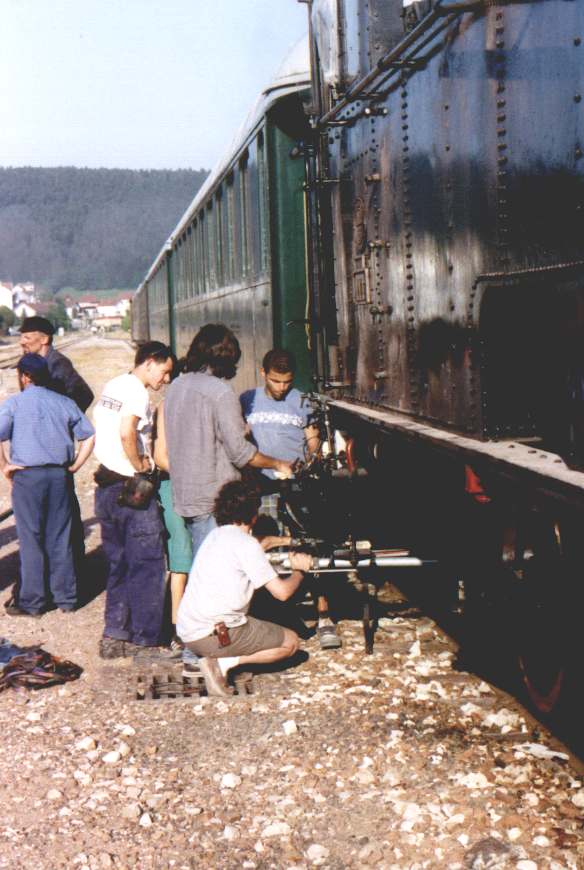 | Mercredi 27 juin 2001 | Tout s'est tellement bien passé que la totalité des scènes ont pu être filmées la veille. Nous n'avons donc pas allumé notre locomotive le 3e jour mais avons profité de regarder ce qui se passe sur un plateau. Signalons au passage que l'ambiance était au beau fixe, tout comme le temps ... avec des acteurs sympathiques et accessibles. |