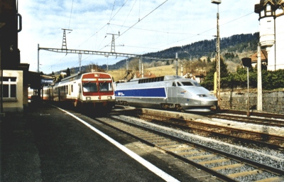 TGV Zürich - Paris et composition TRN en gare de Travers (photo de