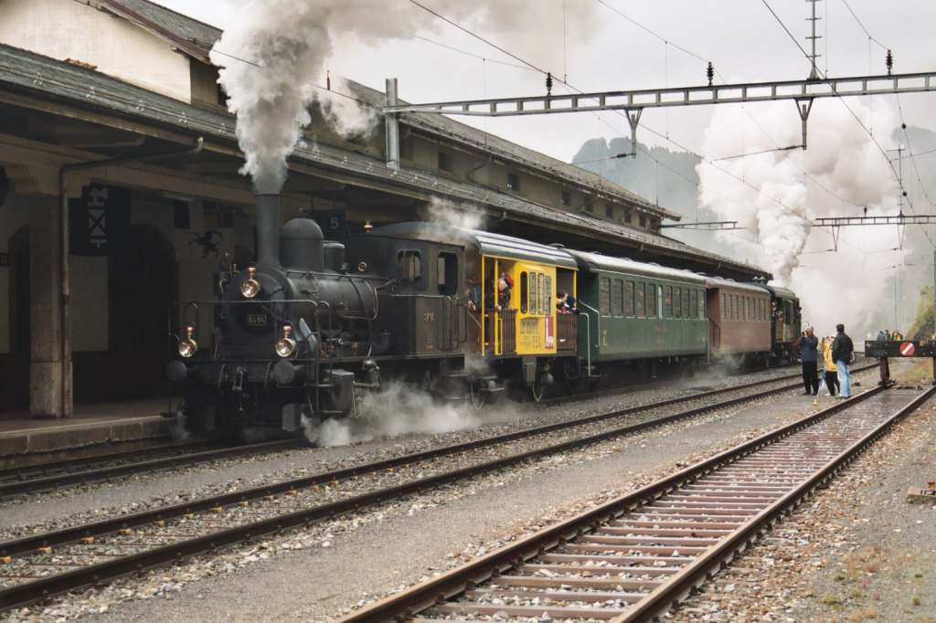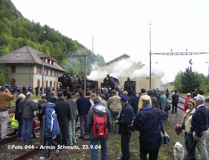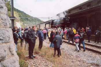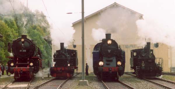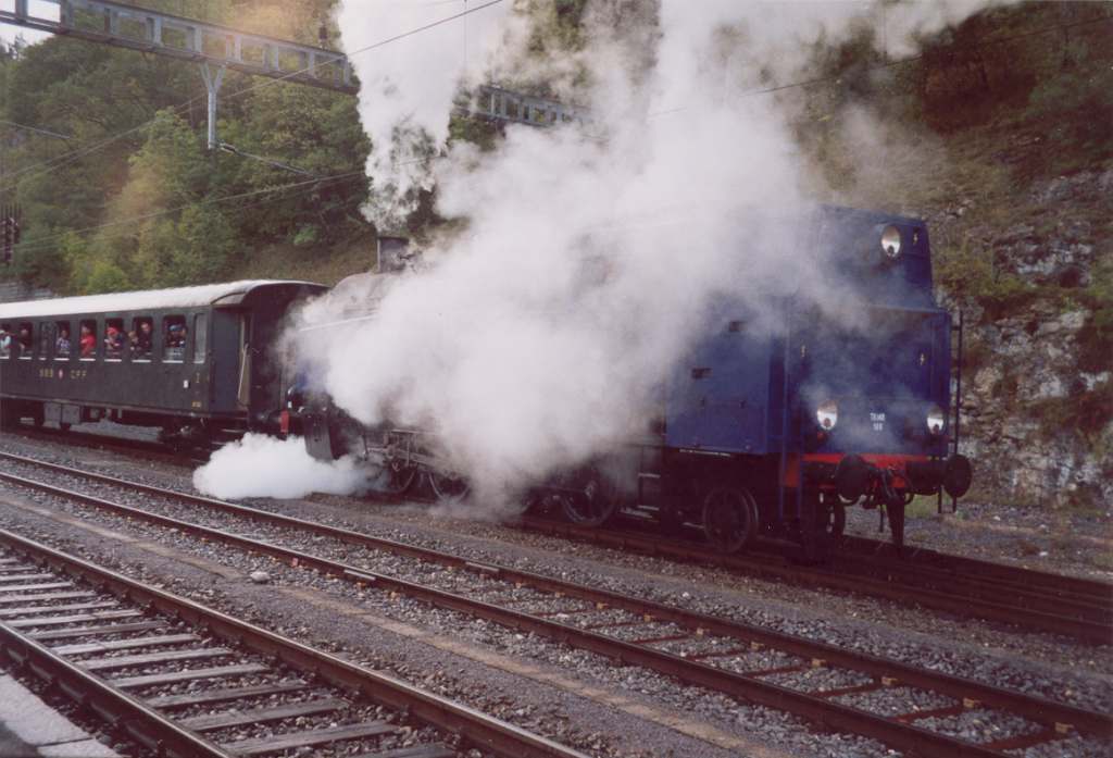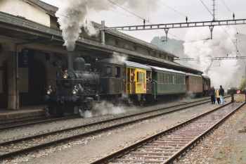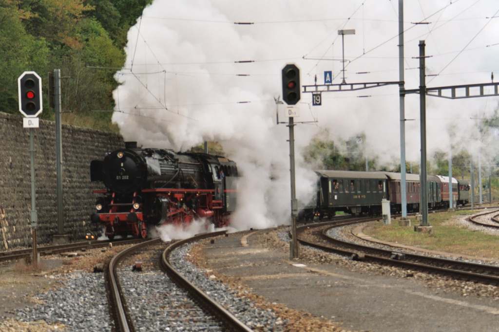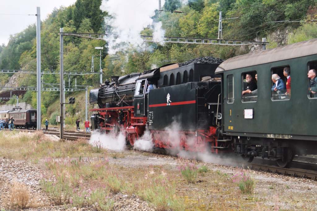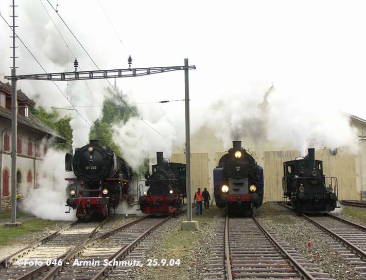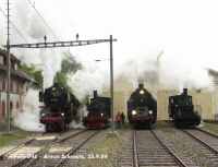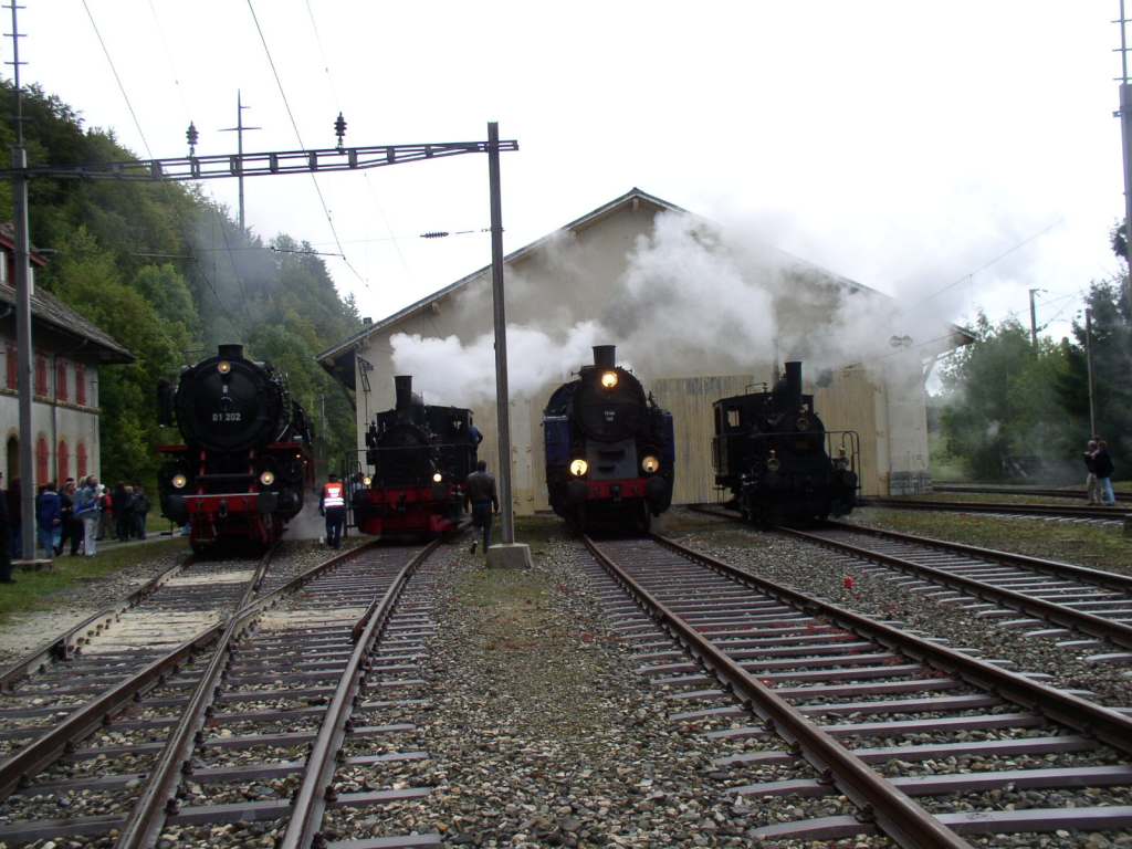 |  23 058 d'Eurovapor, section Sulgen n'a malheureusement pas pu participer, suite à une grave avarie technique. Les voyageurs au départ de Bâle ont tout de même bénéficié d'un voyage inoubliable, tout d'abord derrière l'Ae 6/8 208 de Basel à Lyss, puis derrière la 01 202 jusqu'à Vallorbe (- Martigny) |  64 518 des Vereinigte Dampf-Bahnen : Voyage annulé par suite de manque d'inscriptions ... les personnes intéressées ont été dirigées vers le train tracté par la 01 202 au départ de Lyss. |